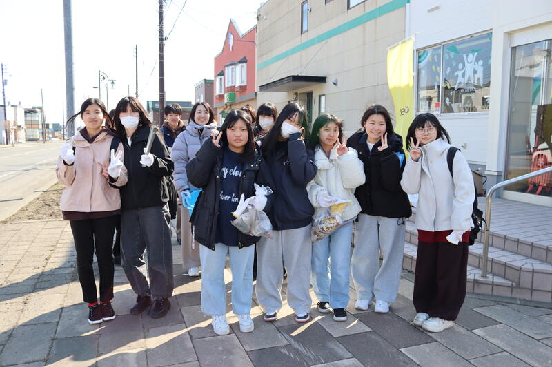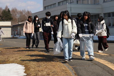 雪解けが進み、カップ麺の容器やたばこの吸い殻など、様々なゴミが見つかりました。生徒たちは協力しながら熱心に清掃に取り組み、地域環境の美化に貢献しました。